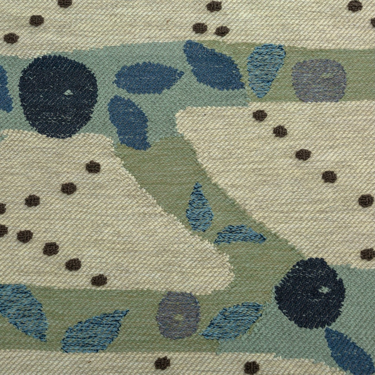 FRAMMENTO - Indigo created by Amy Katz, Herringbone (in one turn), Base in white mix 06, 12 and 1023, Pattern: 0472, Yarn: CH016, CH033, little 4012, Laves: 0515, Yarn: 5010, 5027, 5032, Berries: 0474, Yarn: 1004, 8029, 8045, Circles in bouclé brown 1007 and stitches black 0007 and grey 0518 on the brown, natural and white yarn