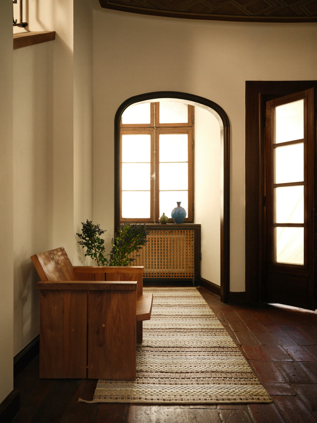 Linnea is a woven, striped rug in which linen yarn is used for both warp and weft. Wool forms the pattern, its warmth and texture offering a soft contrast to the linen’s smooth, cool character. The interplay between the materials creates a lively surface with a distinctly crafted, woven expression.