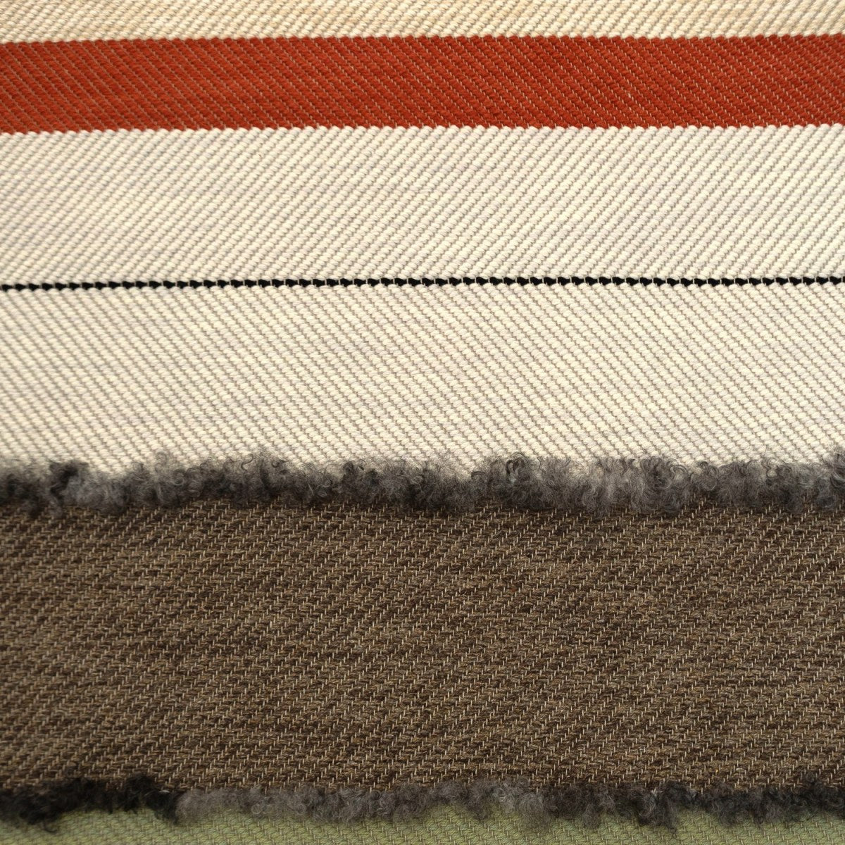 MIHO created by Lars Nilsson, Herringbone with Sheepskin fur, woven end wine mix 3015, CH5226, blue mix 8008, 8015, red mix 3010, 6037, brown mix 17, 11 with black 1006 small stripe, light grey mix 04, 1023, 12, violet mix 3015, 7006, 7003, cream mix 06, 07, CH044, rust red mix 8153, 8154, white mix 1023, CH044 with black 1006 small stripe, brown mix 17, 11, light green mix CH016, 4015, 4001, terracotta mix 6002, 6008, light grey mix 04, 1023, 12, woven end in green mix 8233, 4008, 4007 on the natural yarn