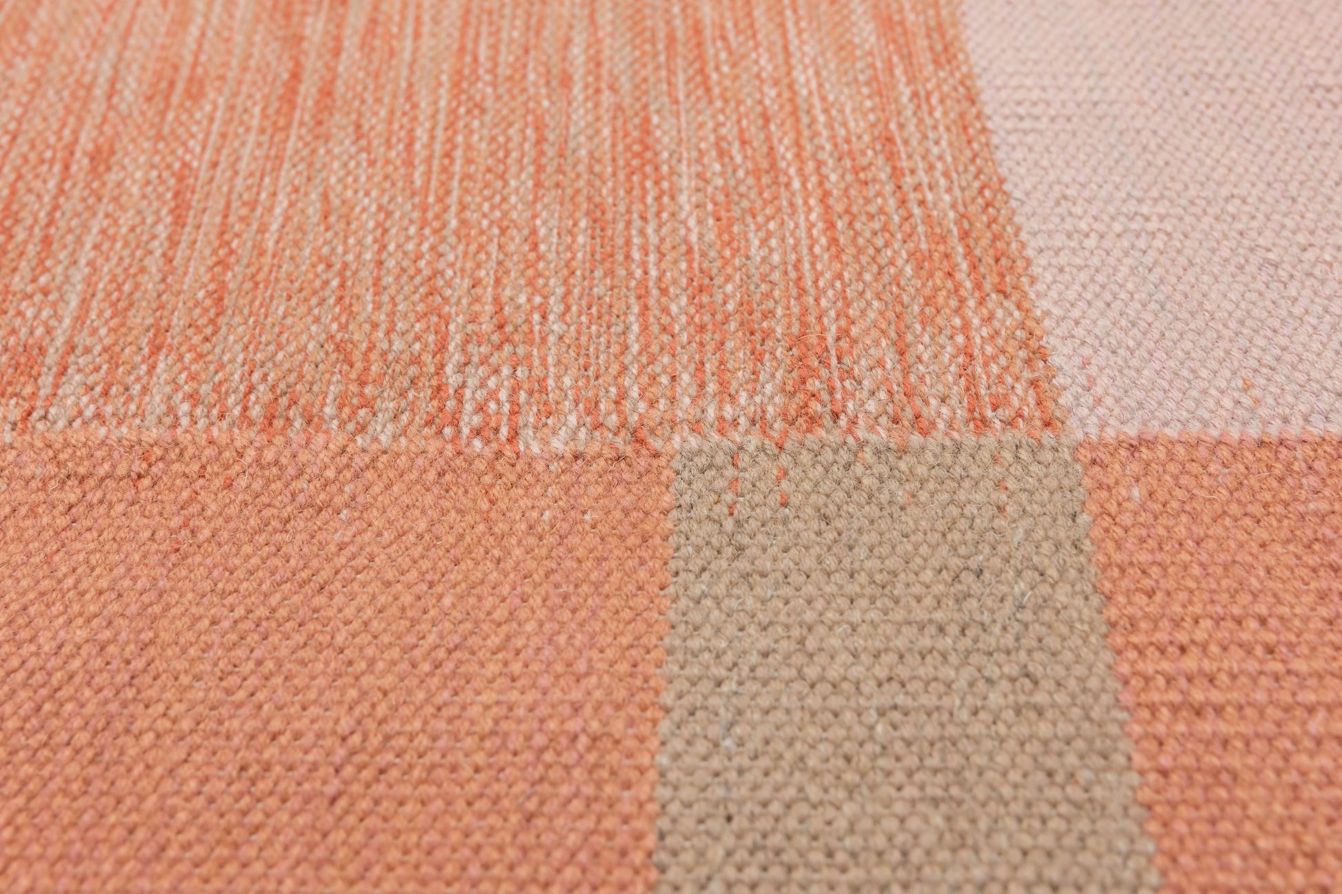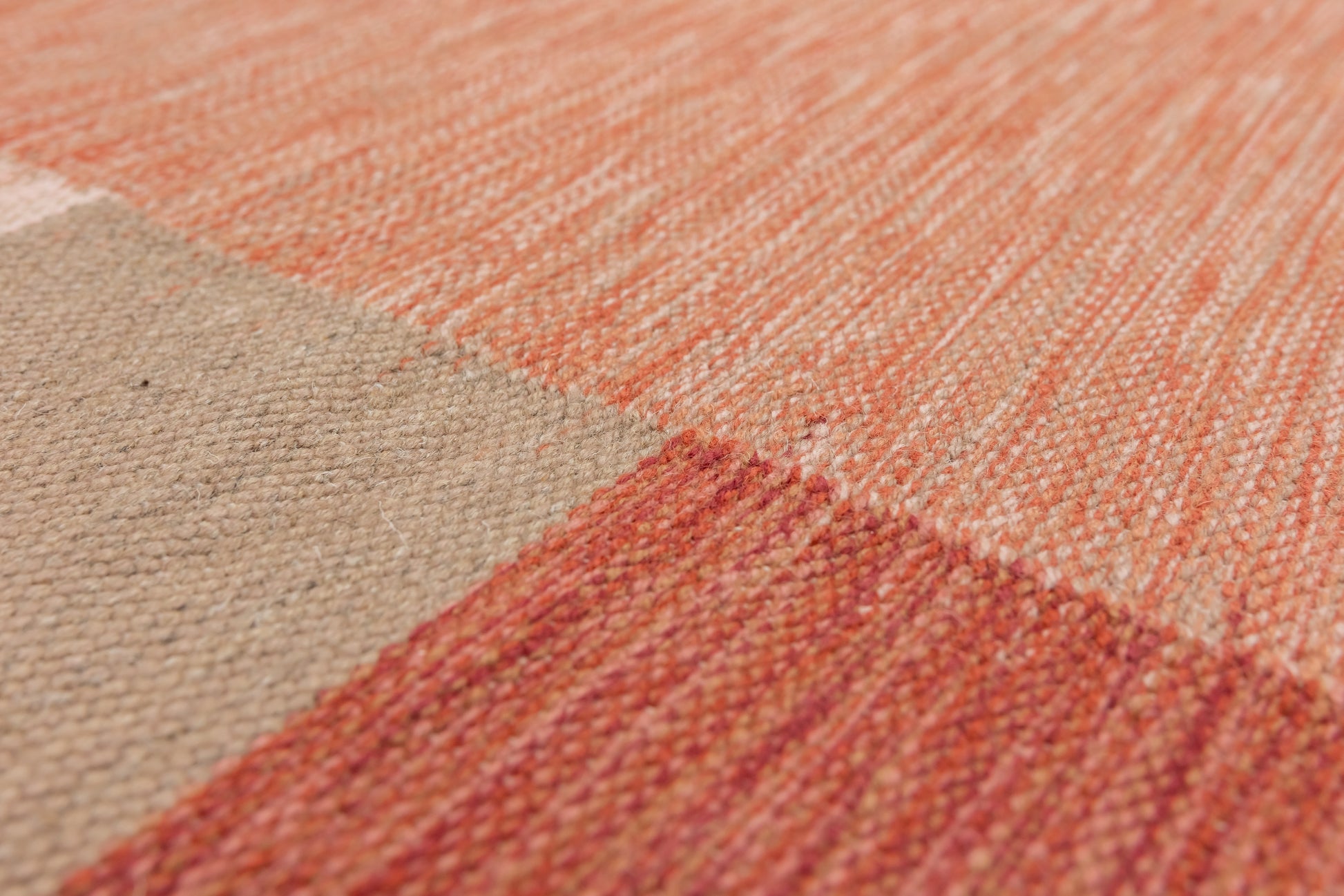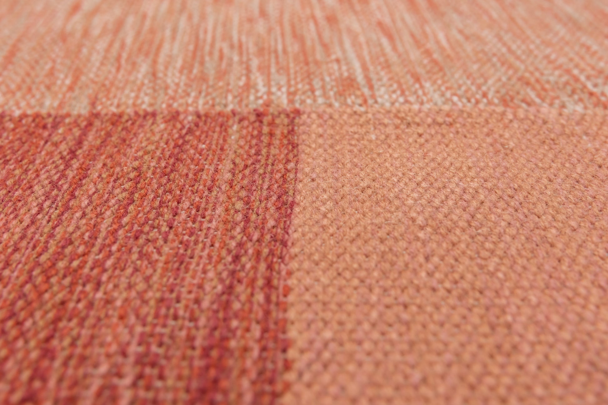 Mosaic is a flat woven wool rug on a linen warp. Its mottled base introduces depth and a gentle sense of movement across the surface, catching the light and subtly shifting throughout the day. Framing the rug is a decorative border of block motifs, woven in closely related shades that create a soft yet captivating contrast.