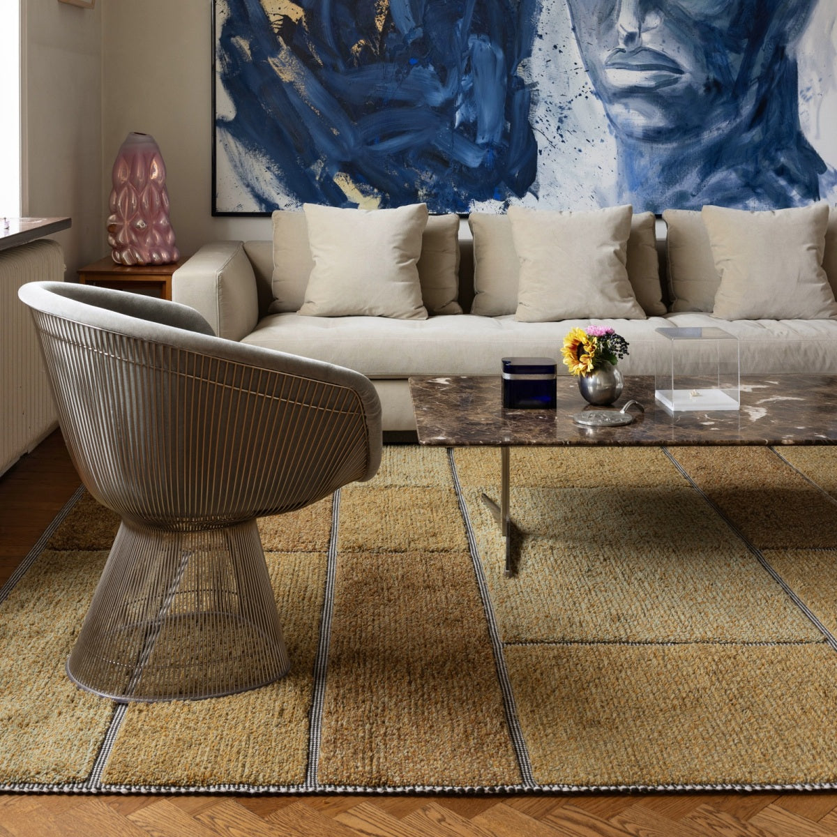 The design Pietra features an asymmetrical chequered pattern with deliberately interrupted lines, offering a modern, graphic touch. The collection comes in various colorways, blending natural hues with a contemporary twist. Available in both a hand-knotted pile and a röllakan version.