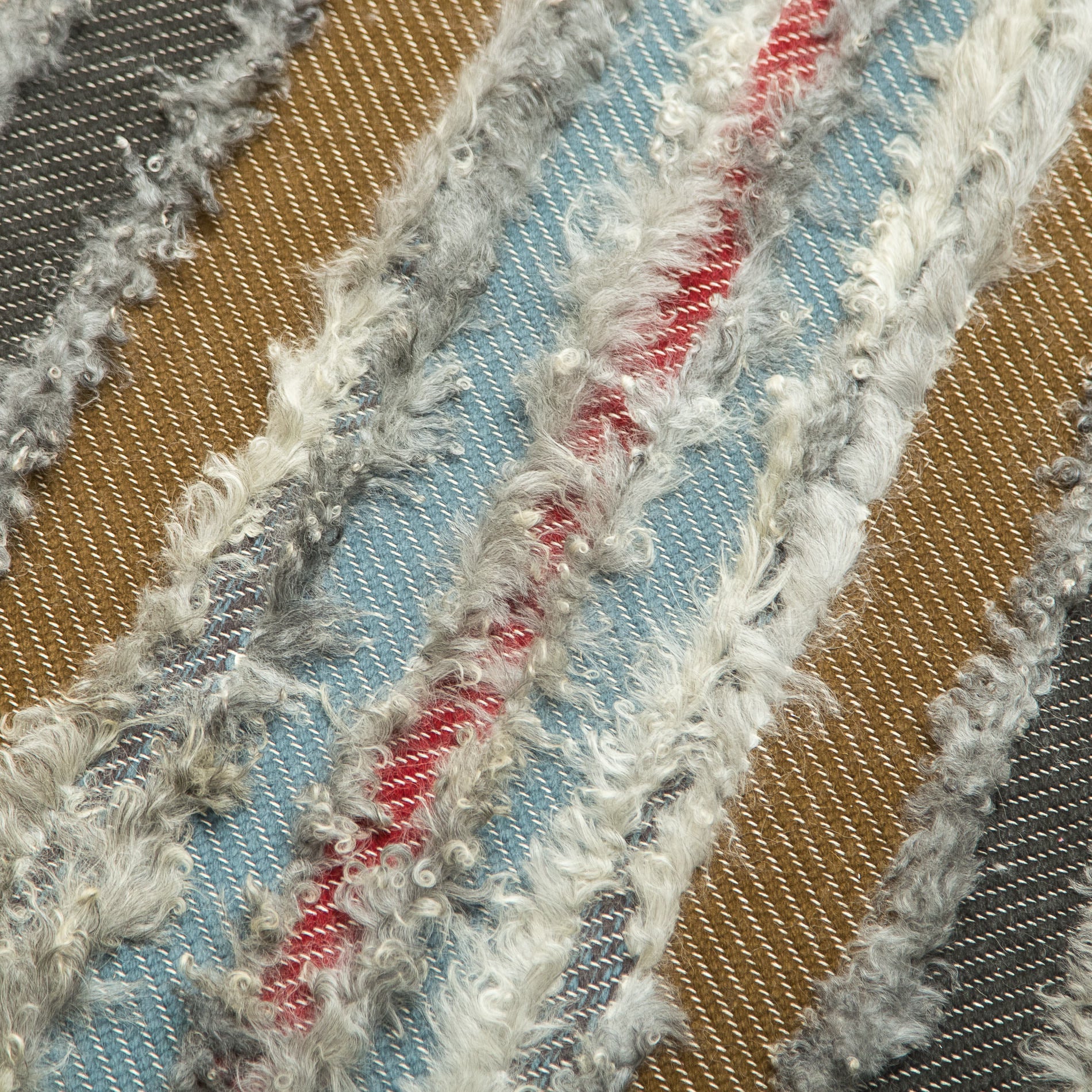 STOCKHOLM by Lars Nilsson Herringbone with sheep fur, striped woven ending in grey mix 05, 1006 and blue 5027, dark blue 5027, dark blue mix 5027, 504, grey-blue mix 504, 262, grey 262, violet 7004, grey mix 262, 08, dark grey 05, dark grey mix 05, 08, grey mix 05, 1021, light grey mix 1007, 1021, grey-black mix 1007, CH7878, black CH7878, mustard CH4225, mix of CH3424, 6020, turquoise CH3424, red 3015 on the natural yarn